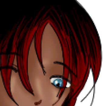 Now, it's time for shading ^^ There are three ways that I shade... I either use masks and create my own color by subtracting from the original RGB values or I use the dodge/burn tools to pick a color. If I don't use masks, I use the dodge/burn tool...but it takes a long time if you're a mouse user because of the pressure-sensitive things and such. We're going to use the first method I described, so hold down Ctrl and click on the skin layer in the layer window to select the contents of the layer. Next, click on the 'Create Layer Mask' button or go to file/layer/add layer mask.../reveal selection. A mask works like tape when you're painting and it operates in grayscale colors. If you click on the mask, you can only paint in colors from black to white. If the color is closer to black, it's opaque (can't see through it), but if it's closer to white, you can. Click on the layer again, and test your mask to make sure you got the right area. Scribble color on an area outside his skin and if you can't see it, it worked.