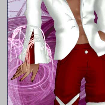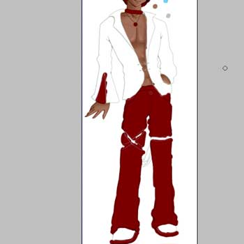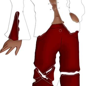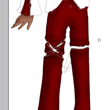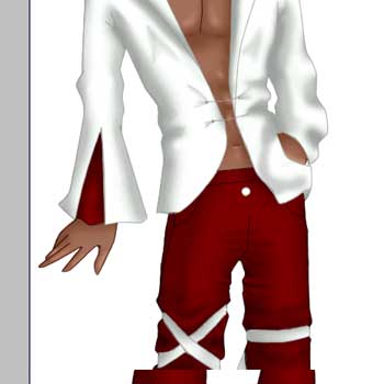 traingular area on his right sleeve red. We're using the R121 G0 B0 color. Since you've probably made a bit of a mess, go back and erase the areas that go